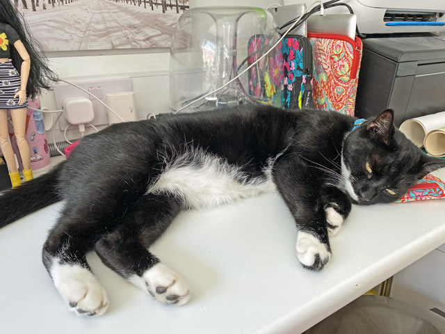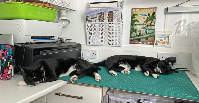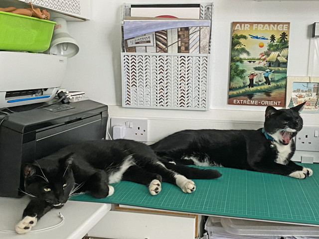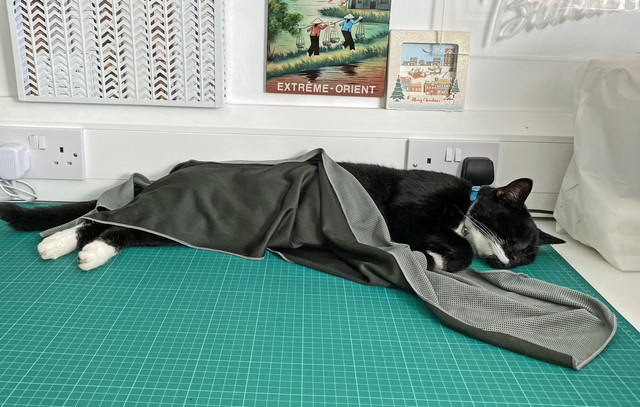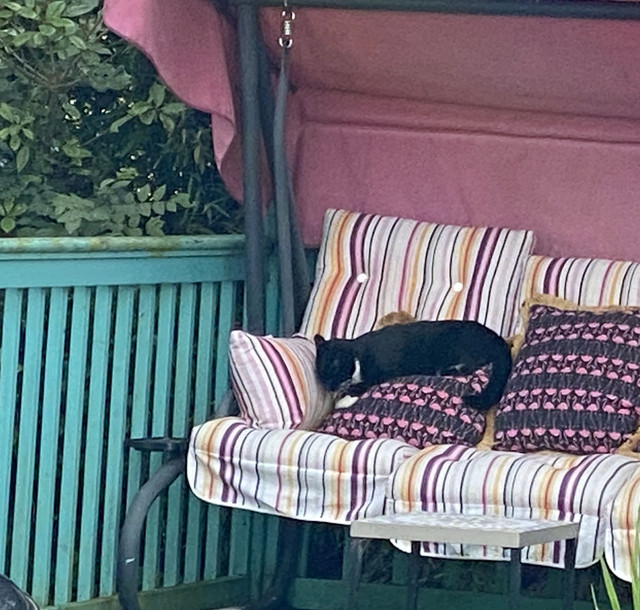 Much cooler day with lots of storms. In the last week it has been way to hot for anything but swimming and sitting with a fan blowing up your kilt! Most of my cats stayed indoors where it was a little cooler but the outdoor cats...well, they had my study and the fan on full blast. My garden gets so very, very hot it's like living on the sun. My garden thermometer only goes up to 50c 122f it was up there and would have maybe gone a lot higher in three days this week, Jordan lived the ice towel. Perri did try the swing in the jungle at the end of the garden at least for a while!