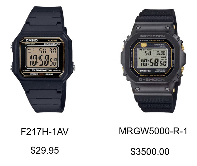 I have used watches by Casio for many decades. I like their look, they are accurate, they have a long battery life, and they come at a very good price. When I turn on the light on the screen (bottom right button) it seems to be less bright than before. After 7-8 years I think the battery is getting weaker and I decided it's time to get a new watch. My current watch, the 217H model cost me $26.00 or $26.95. I wanted to get the same model but they now have an improved model - the F217H-1AV. It looks exactly the same as mine but now costs $29.95. I did some browsing on their other selections and saw the model MRGW5000-R-1 priced for $3,500.00. The looks are similar but they don't mention what extra features it has. I would probably look more handsome and sexier wearing this model, but I never leave the building other than for doctor's appointments. I finally decided on getting the cheaper model (on the left.) It should be delivered by Sept. 30. What do you think? Do you think I made the right choice? Would you have bought the same watch?