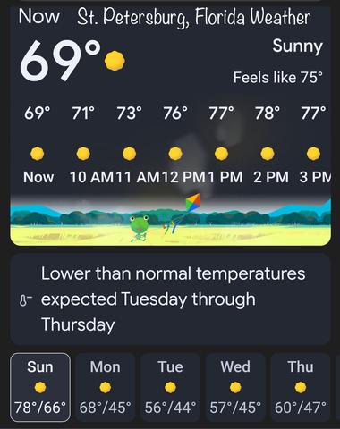Posted by Mr. Bill on January 25, 2026, 9:22 am Partly cloudy with a high of 78° today with cooler temperatures moving in. Message Thread ST. PETERSBURG, FLORIDA WEATHER - Mr. Bill January 25, 2026, 9:22 am « Back to index