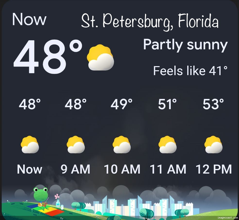 Posted by MR.BILL on March 17, 2026, 8:44 am Currently 48° and partly sunny. Message Thread ST. PETERSBURG, FLORIDA WEATHER - MR.BILL March 17, 2026, 8:44 am « Back to index