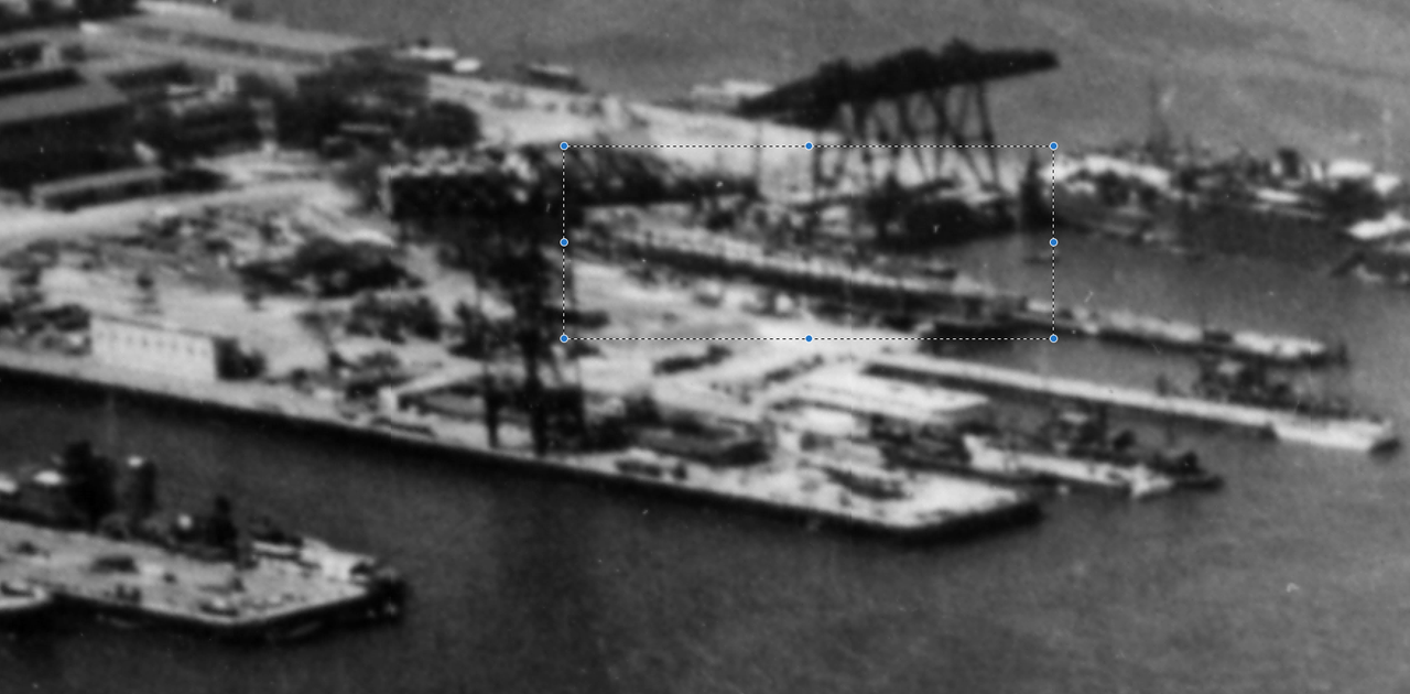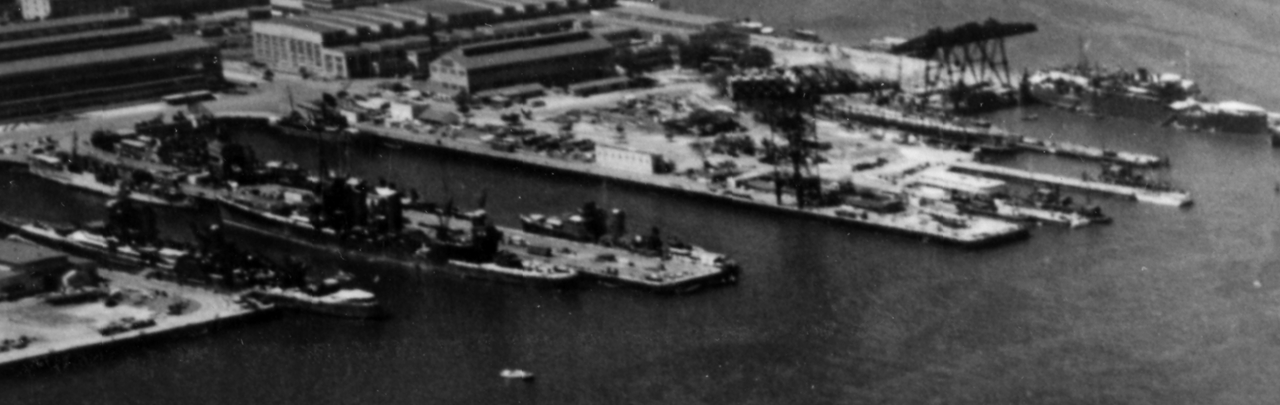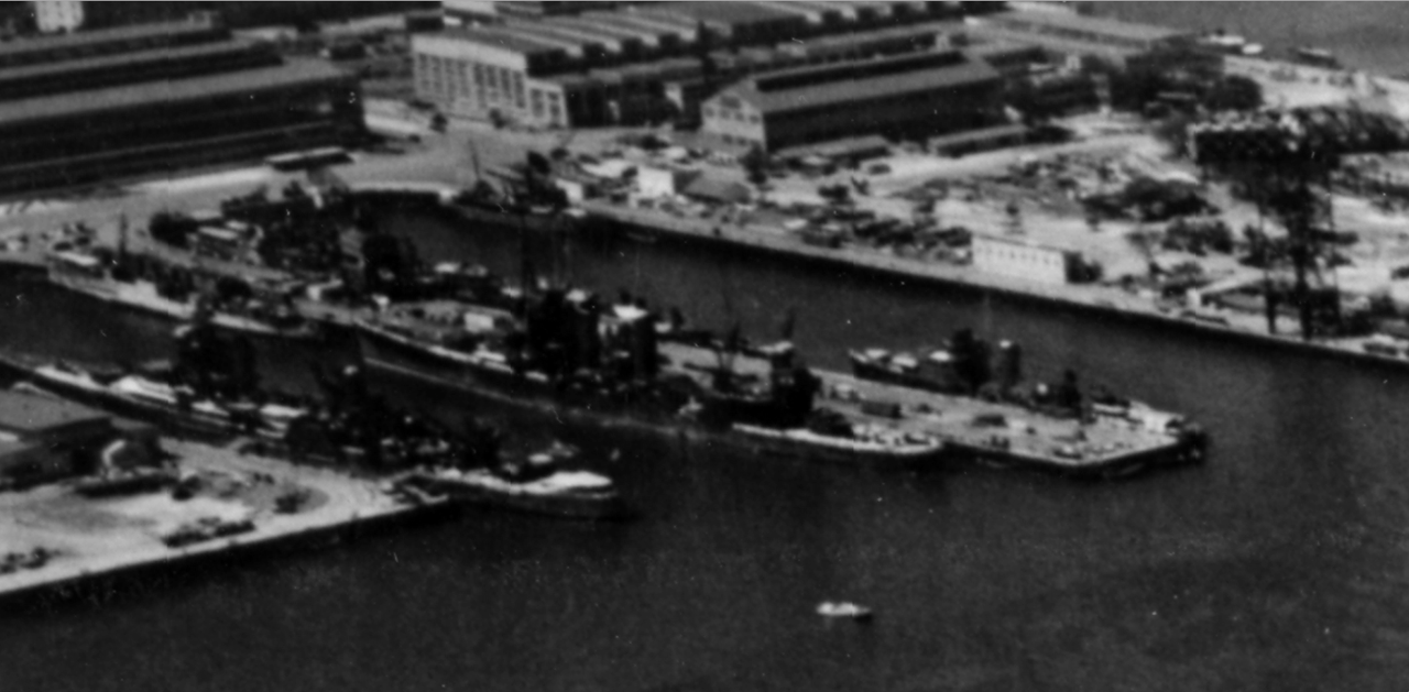This shot was taken on 10/13/41. It shows that USS Raleigh has been replaced by USS San Francisco at berth B-17. USS Breeze has moved from B-18 to the Marine Railway giving us a "clearer" look at USS Mongomery's hull which is also very light.