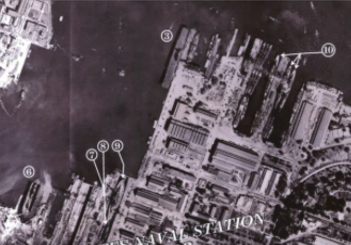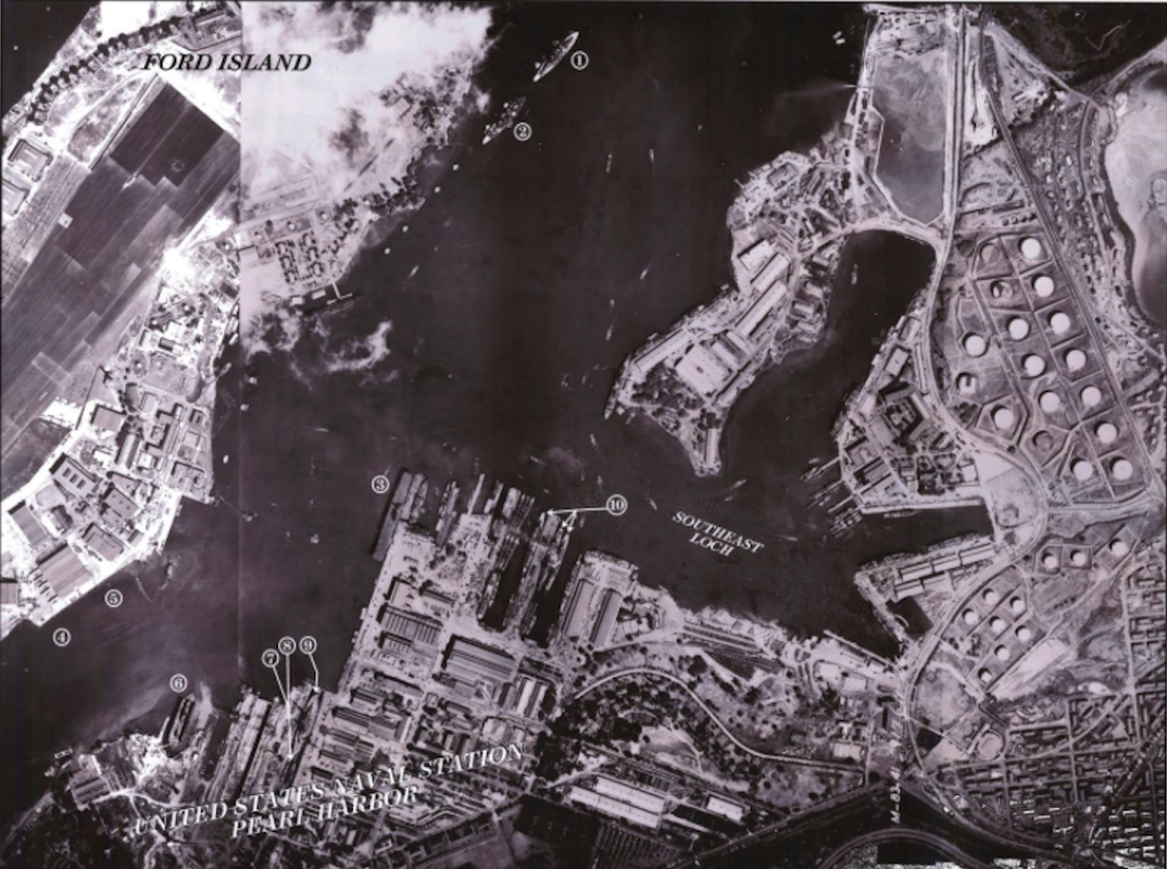 In this photo, USS Arizona is at berth F-8 identified as the circled (1). USS Nevada is at berth F-7 (2). USS Oklahoma (9) is in Dry Dock #1 completing her repairs from her collision with USS Arizona.
