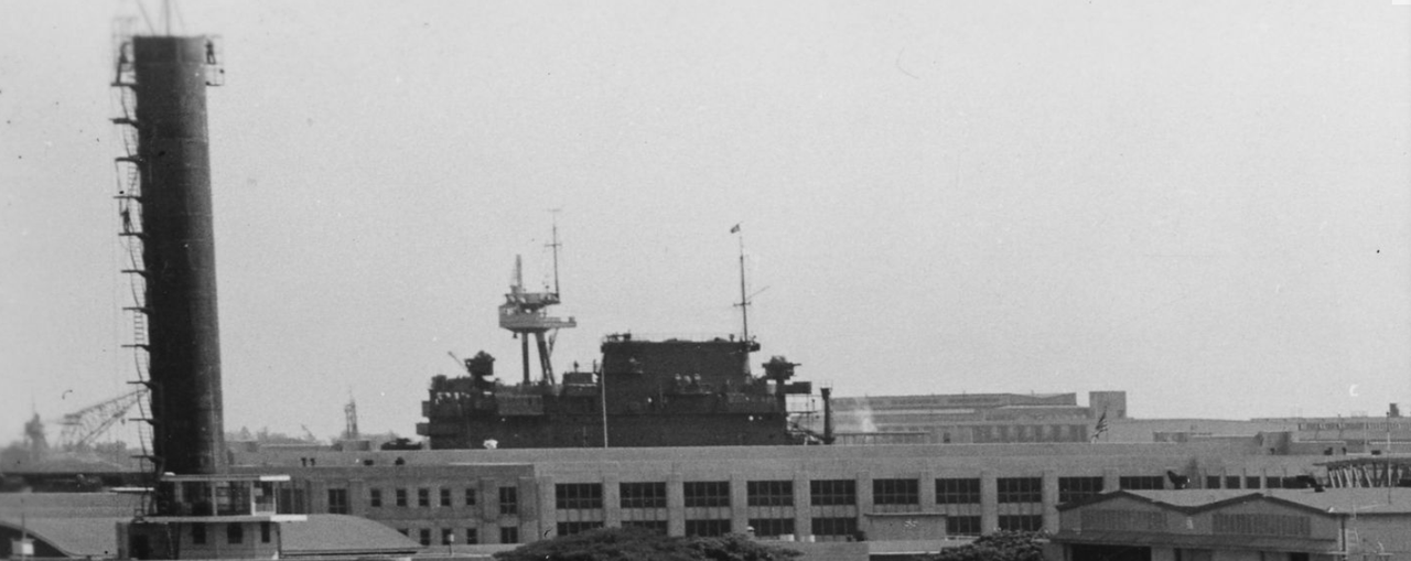 This is a cropped shot of a much larger picture taken from the West side of Ford Island looking across the island towards the navy yard. Here we can see the Forward and the Main Tripod Masts of USS Arizona in Drydock #1. This photo also captured the Superstructure of USS Enterprise at berth F-2.