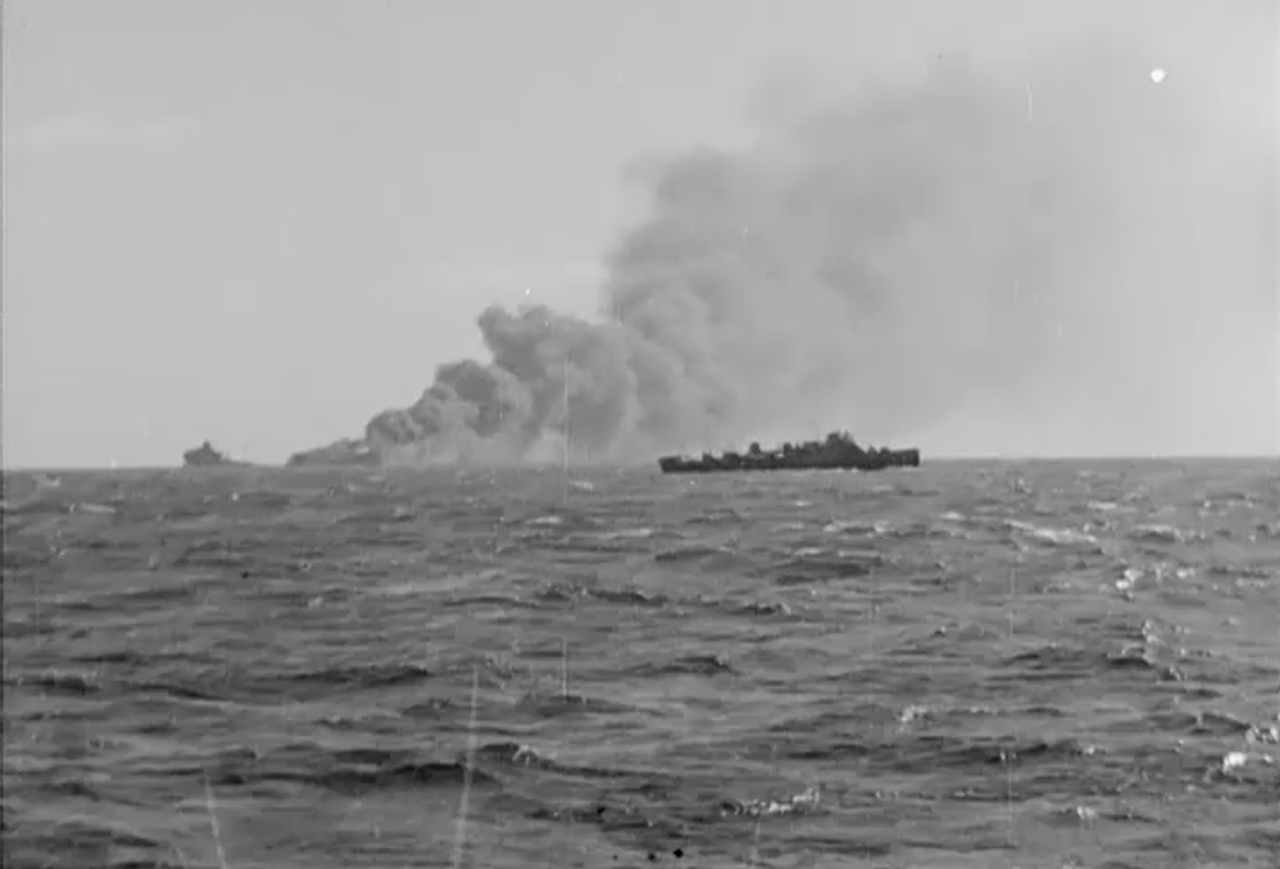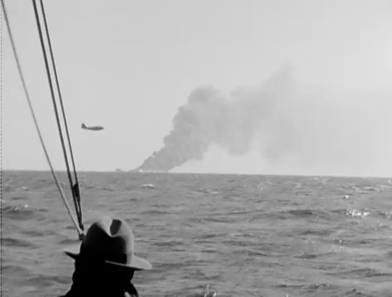 I cannot give you any more info than what you see in these two shots. I cannot identify the plane or the ship in the foreground. To me, the sinking ship appears to be an Oiler.
