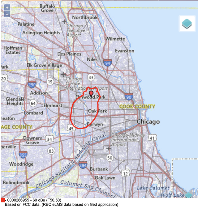 The modification on 3/10/2025, the images & text & GPS coordinates locate it @ Elmwood Park, IL (see structure filling below) but the COL is now Chicago. With WCXP-LP so close, no matter what engineering wonders are performed, even if the patterns all point due south, this will be another 103.9 horror scenario of interference if allowed downtown.
