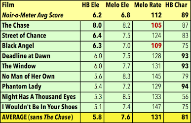 THE CHASE, a more intensely developed version of the Woolrich formula (both by him and by Arthur Ripley, who definitely gave it something extra), is the anomaly here, but not too anomalous, as the score for "hard-boiled character strength"(far right column) indicate. (The higher the "Melo rate," the more of a "melo-noir" the film is; the lower the "HB character strength," the less hard-boiled the characters in the film are.) Overall "melo element strength" is at its strongest in NIGHT HAS A THOUSAND EYES...